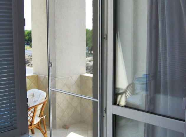 Устанавливается на дополнительные полозья, по которым её можно переместить на любую часть рамы, сама сетка на роликах, по периметру самой сетки вставляется фетр, чтобы даже между створкой и сеткой не пролетели насекомые.